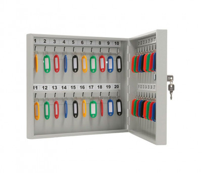 Ключница AIKO KEY 40 предназначена для хранения и защиты от несанкционированного использования ключей. Изготовлен из стали 0,9 мм. Комплектуется металлическими крючками для размещения ключей, самоклеящимися номерками, брелоками в количестве 40 шт. Закрывается ключевым замком. Цвет ключницы светло-серый (Ral 7038)