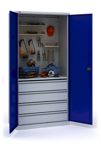 В комплектацию шкафа ИП-1/5 входит: корпус шкафа, двери, 1 полка ИП-1, 2 перфорированных экрана ИП-1, 4 выдвижных ящика ИП-1, 2 удлиненные полки, 1 укороченная полка, 1 держатель ключей, 10 крючков длиной 8см. Шаг перфорации для установки полок 83 мм. Нагрузка на полку - 60 кг, на ящик - 30 кг. Шкаф оборудован ключевым замок повышенной секретности и ригельной системой запирания.