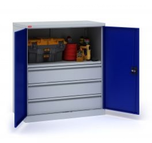 В комплектацию шкафа ИП-1-0,5/5 входит: корпус шкафа, двери, 1 съемная полка ИП-1 (ВхШхГ) 917х438 мм, 3 выдвижных ящика ИП-1 (ВхШхГ) 161х847х455 мм. Шаг перфорации для установки полок 83 мм. Нагрузка на полку - 60 кг, на ящик - 30 кг. Шкаф оборудован ключевым замок повышенной секретности и ригельной системой запирания.