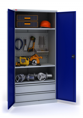 В комплектацию шкафа ИП-1/2 входит: корпус шкафа, 3 полки ИП-1, 1 перфорированный экран ИП-1, 2 выдвижных ящика ИП-1, 1 укороченная полка, 1 держатель ключей, 10 крючков длиной 8 см. Шаг перфорации для установки полок 83 мм. Нагрузка на полку - 60 кг, на ящик - 30 кг. Шкаф оборудован ключевым замок повышенной секретности и ригельной системой запирания.