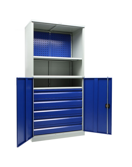 Шкаф ТС 1995/2-022050 предназначен для хранения инструментов, слесарных приспособлений и других изделий на предприятиях, мастерских и автосервисах. Рабочие секции разделены на две части-открытую, для быстрого доступа к инструментам и комплектующим, и закрытую, запираемую на двери, для защиты содержимого. Шкаф сертифицирован на соответствия требованиям ГОСТ 16371. Изготовлен из металла толщиной 0,8 мм. Выдерживает максимальную нагрузку: на шкаф-500 кг, на полку-80 кг, на ящик-30 кг, на экран-20 кг. В комплектацию входит: шкаф ТС-1995/2, две металлические полки TCSh 95х47, пять выдвижных ящиков TCF 87х45, два перфорированных экрана TCSh 95х47, двери. В дверь установлен ключевой замок (Burg GSC813 в комплекте 2 ключа) с ригельной системой запирания. Шаг регулировки высоты полок 50 мм. Цвет: корпус- серый (Ral 7035), цвет двери и лицевая панель выдвижных ящиков -синий (Ral 5002). Поставляется в разобранном виде