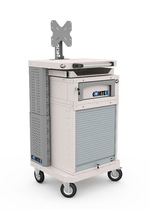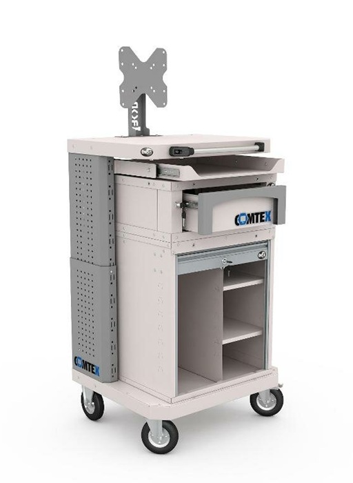 Дополнительно на тележку можно установить: выдвижную полку Comtex, выдвижной ящик Comtex, кронштейн для монитора, кронштейны для RACK модуля, цоколь для тумбы Comtex, лоток для тумбы/тележки Comtex, карман для документов А4 и другие аксессуары.