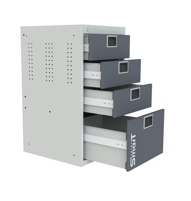 В комплектацию верстака входит: столешница 1280 SMART, тумба SMART 4, тумба SMART 1-1, тумба-пенал SMART один перфорированный экран SMART 1280, комплект косынок для экрана SMART. Столешница выполнена из фанеры 27 мм со стальной окрашенной накладкой 1,2 мм. Тумба SMART 4 комплектуется 4 выдвижными ящиками. Выдвижные ящики оборудованы телескопической системой полного выдвижения ящиков с фиксацией в закрытом состоянии (50000 циклов). Тумба SMART 1-1 комплектуется одной дверью, одним выдвижным ящиком и регулируемой по высоте полкой. Тумба-пенал SMART выдвигается на четырех телескопических направляющих и предназначена для хранения крупногабаритных инструментов и аксессуаров. Все тумбы закрываются ключевым цилиндровым замком. Секретность замка 2000 комбинаций (2 ключа в комплекте). Внутренние стенки дверей и перфорированный экран имеют универсальную перфорацию для размещения навесных элементов. Шаг квадратной перфорации (10 мм) - 38х38 мм, круглой (7 мм) - 25х38 мм. Возможна смена стороны открывания двери тумбы. Цвет верстака: корпус тумб - серый Ral 7035, столешница, двери тумб, лицевая панель ящиков - антрацит Ral 7016. Поставляется в разобранном виде.