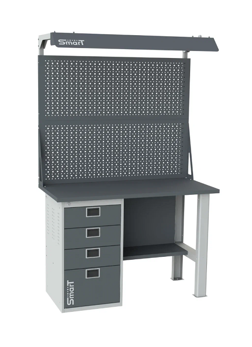 В комплектацию верстака входит: столешница 1280 SMART, полка/стенка 625 SMART, тумба SMART 4, опора SMART, два перфорированных экрана SMART, комплект освещения SMART. Столешница выполнена из фанеры 27 мм со стальной окрашенной накладкой 1,2 мм. Опора сварная выполненная с применением высокоточного сварочного оборудования. Имеет нижнюю перекладину для усиления устойчивости конструкции. Размер опоры (ВхШхГ): 835х500х135 мм. Тумба SMART-4 комплектуется 4 выдвижными ящиками. Выдвижные ящики оборудованы телескопической системой полного выдвижения ящиков с фиксацией в закрытом состоянии (50000 циклов). Все ящики закрываются центральным ключевым замком. Секретность замка 2000 комбинаций (2 ключа в комплекте). Перфорированный экран SMART имеет универсальную перфорацию (квадрат 10 мм c шагом 38х38 мм и круг 7 мм с шагом 25х38 мм) для размещения различного типа крючков и держателей инструмента. Цвет верстака: опора, корпус тумбы - серый Ral 7035, столешница, полка/стенка - графит Ral 7016. Поставляется в разобранном виде.