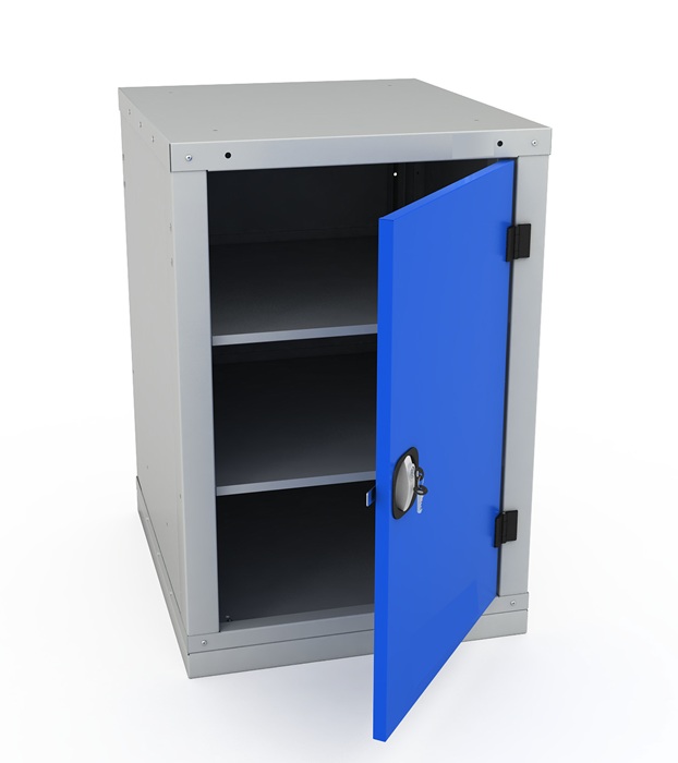 Тумба Woker 01 имеет две полки регулируемые по высоте с шагом 50 мм. Полки тумбы установлены на стальные салазки, которые позволяют выдвигать полку на себя на 70% для облегчения разгрузки/погрузки. Дверь тумбы закрывается на цилиндрический ключевой замок со стальной поворотной ручкой, секретность замка 2000 комбинаций. Открывание двери на 180 градусов. Цвет: корпус верстака - серый Ral 7035, лицевая панель тумбы Ral 5005.