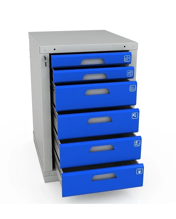 Тумба Woker 06 комплектуются 6 выдвижными ящиками (4 средних -135 мм и 2 малых- 65 мм). Полезный размер ящика: (ШхГ) 459х612 мм. Ящики комплектуются противоскользящими ковриками и набором наклеек с пиктограммами для маркировки содержимого ящика. Тумба закрывается на центральный цилиндрический замок (секретность замка 2000 комбинаций). Цвет: корпус верстака - серый Ral 7035, лицевая панель тумбы Ral 5005.