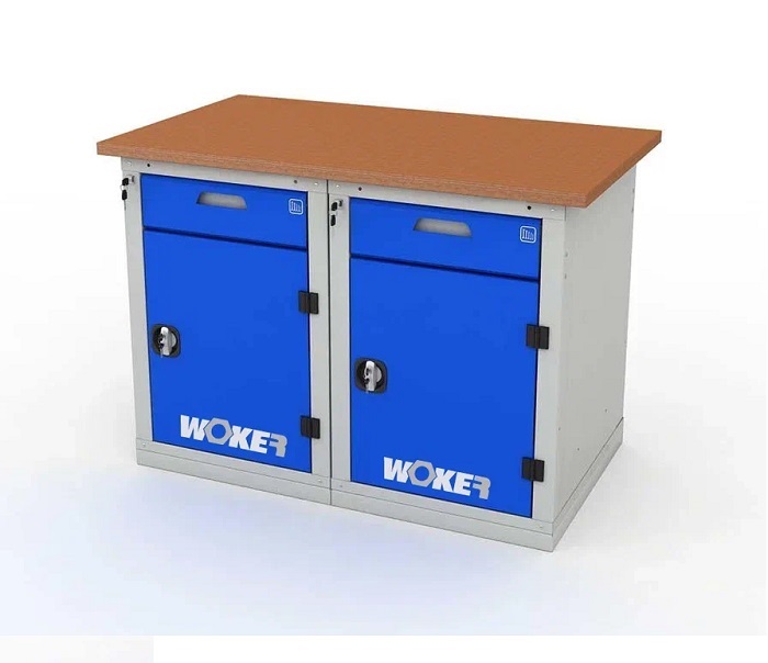 В комплектацию верстака входит: столешница Woker 1200, две тумбы Woker 02. Столешница выполнена из шлифованной березовой многослойной фанеры толщиной 30 мм. Снаружи фанера обработана влагостойким антисептиком цвета "красное дерево", что придает фанере повышенную влагостойкость и более темный цвет. Тумба Woker 02 имеет одну регулируемую по высоте полку (шаг 50 мм) и один выдвижной ящик. Ящик комплектуется противоскользящим ковриком и набором наклеек с пиктограммами для маркировки содержимого ящика. Полезный размер ящика: (ШхГ) 459х612 мм. Полки тумб установлены на стальные салазки, которые позволяют выдвигать полку на себя на 70% для облегчения разгрузки/погрузки. Дверь тумбы закрывается на цилиндрический замок со стальной поворотной ручкой, секретность замка 2000 комбинаций. Открывание двери на 180 градусов.